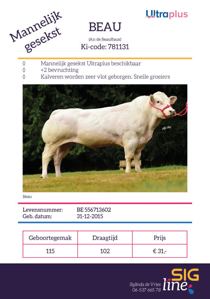 Met een Belgisch Blauw stierkalf heeft u meer opbrengsten! Beau stempelt met goed gekleurde kalveren die vlot geboren worden. De vlezigheid van de kalveren zorgt ervoor dat je direct een mooi kalf hebt, maar dat geen problemen geeft met de geboorte. De vitale kalveren zorgen ervoor dat de kalveren goed groeien.